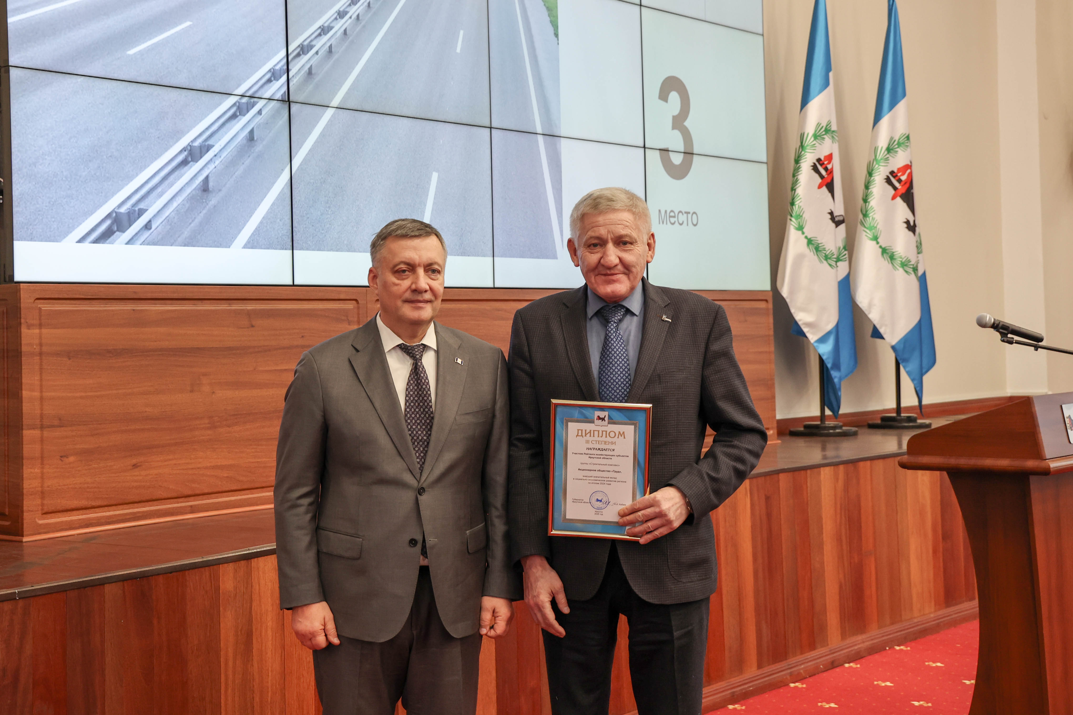 2 февраля 2026 года в Правительстве Иркутской области состоялась торжественная церемония награждения победителей рейтинга хозяйствующих субъектов по итогам 2024 года. Правительство Иркутской области ежегодно проводит Рейтинг хозяйствующих субъектов Иркутской области, который позволяет определить лидеров в различных видах экономической деятельности на территории региона и способствует формированию положительного имиджа предприятий. Рейтинг оценивает деятельность предприятий различных масштабов, включая крупный и малый бизнес, а также муниципальные организации. АО «Труд» по итогам 2024 года получило диплом III степени в группе «Строительный комплекс» в рейтинге хозяйствующих субъектов Иркутской области.